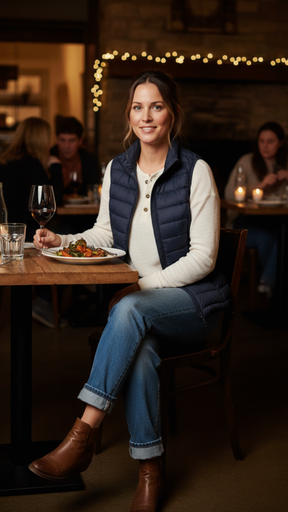 When temperatures drop but you’re craving comfort over formality, a puffer vest layered over a henley creates the perfect casual-cool dinner look. You’ll love how this combination balances warmth with effortless style, letting you move freely throughout your evening plans.