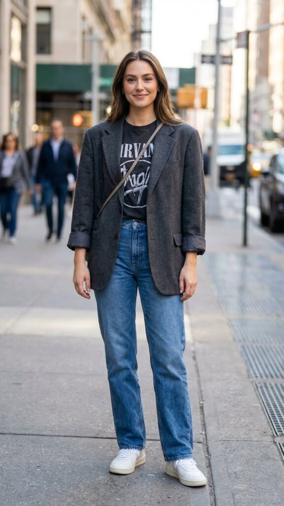 Nothing says “I’m stylish but also deeply unbothered” quite like throwing a structured blazer over your favorite band tee. This combo works because it’s all about contrasts. The blazer adds polish, the graphic tee keeps things relaxed, and you get to look like you understand fashion on a molecular level.