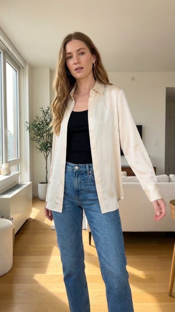 There’s something incredibly chic about a silk shirt worn open over a tank or bralette. It moves beautifully, catches light in all the right ways, and makes you look like you vacation in places with good wine.
