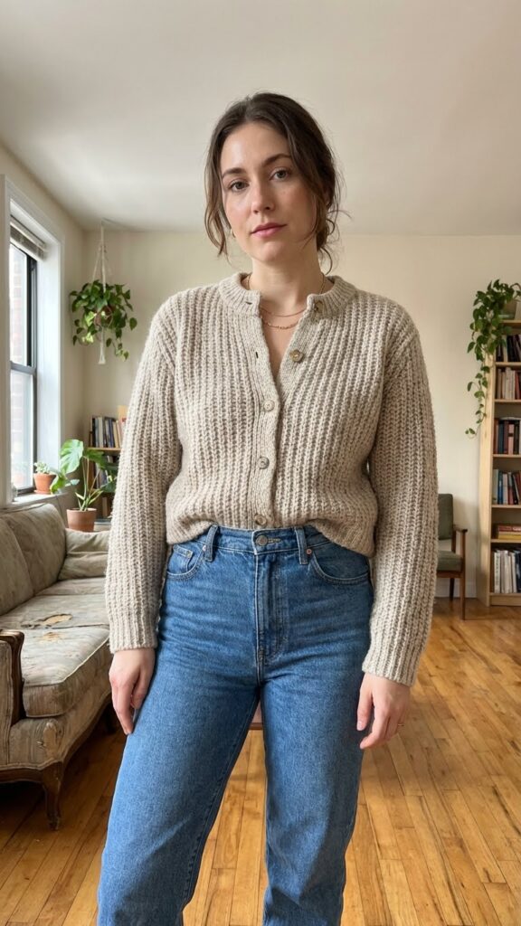 Button up a chunky cardigan, skip the layer underneath, and suddenly you’ve got a whole top situation happening. This look works particularly well with high waisted bottoms and creates a cozy yet intentional vibe perfect for indoor gatherings.