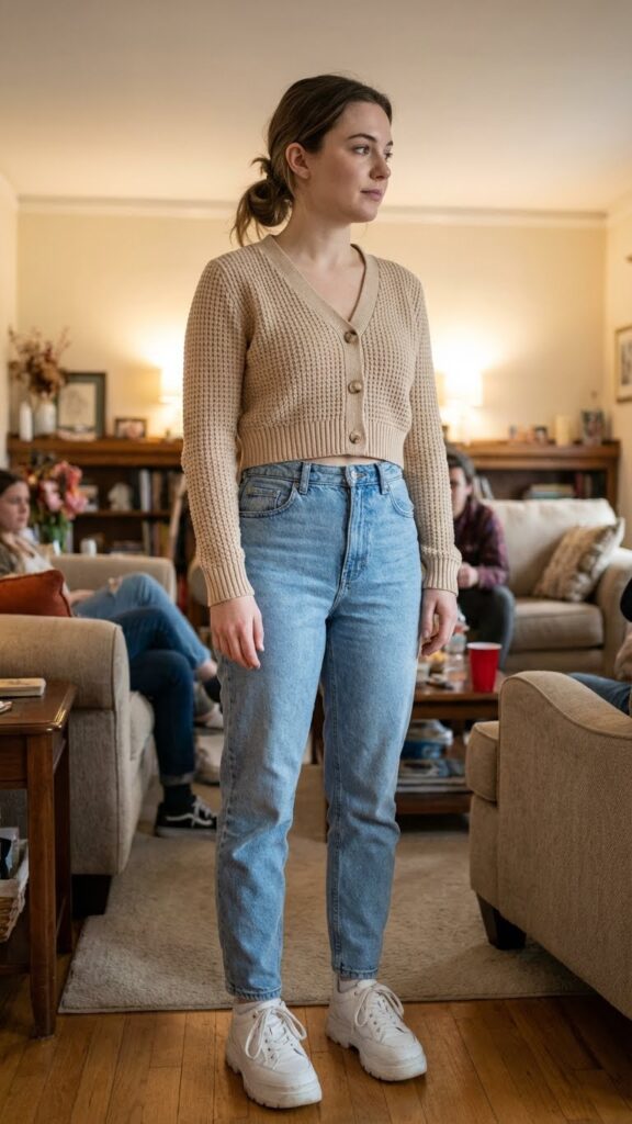 Is it even a casual party if someone isn’t wearing this exact combination? High waisted mom jeans paired with a cropped cardigan create that cozy yet put together vibe everyone’s chasing. The proportions balance perfectly, and you look like you stepped out of a Pinterest board.