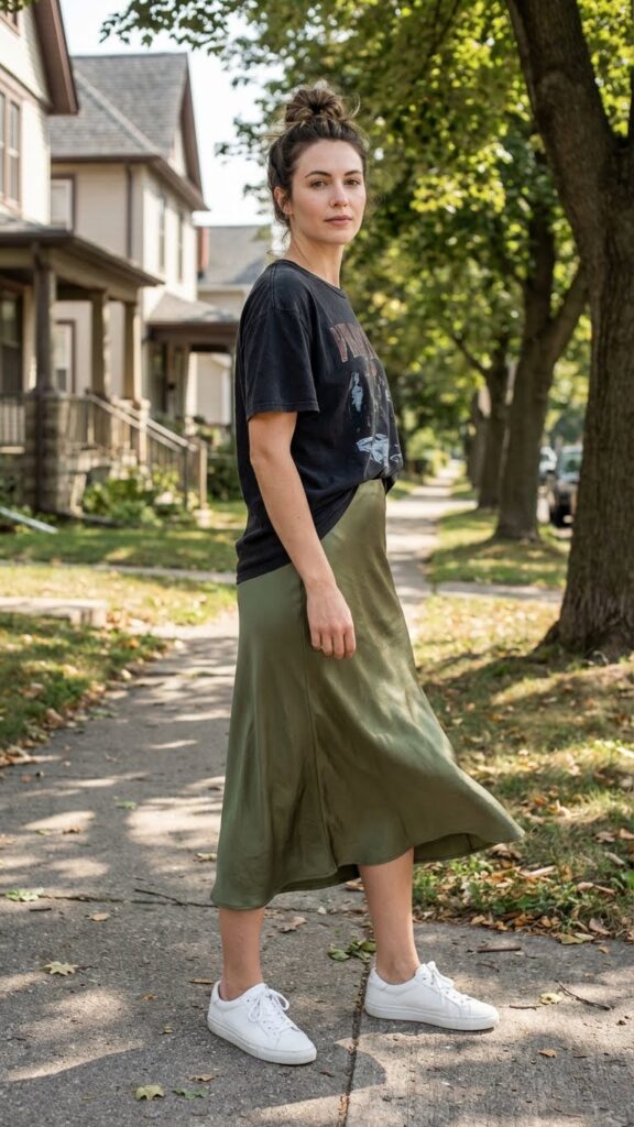 Satin or pleated skirts work beautifully here. Tuck the tee in loosely, add a belt if you’re feeling fancy, and finish with boots or even clean sneakers. The contrast between polished and relaxed is where the magic happens.