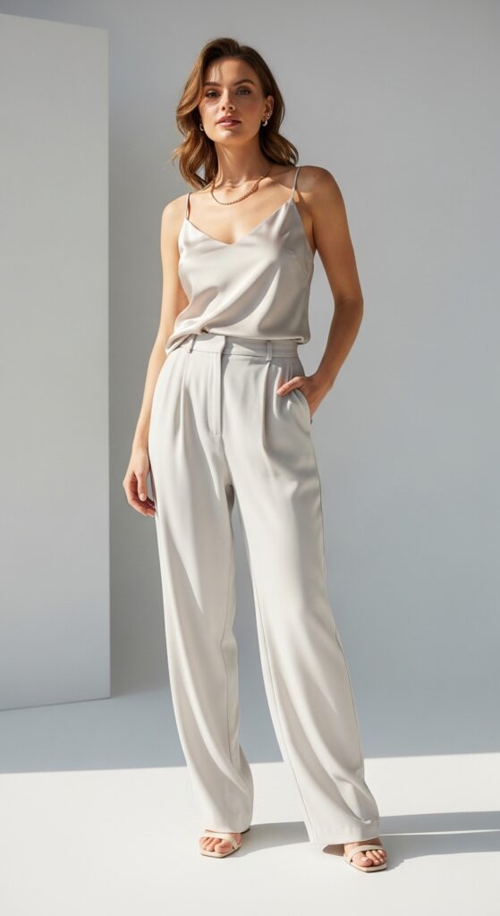 This works for warm weather as is, or layer a lightweight cardigan over top when temperatures drop. The cami adds just enough polish to transform regular trousers into something special. Stick with neutral tones for a timeless look, or experiment with jewel tones for something bolder.