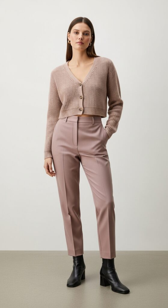 I’m convinced cropped cardigans were invented for high waisted trousers. The proportions just work. You get that defined waistline without needing a belt, and the overall vibe is cozy meets chic.