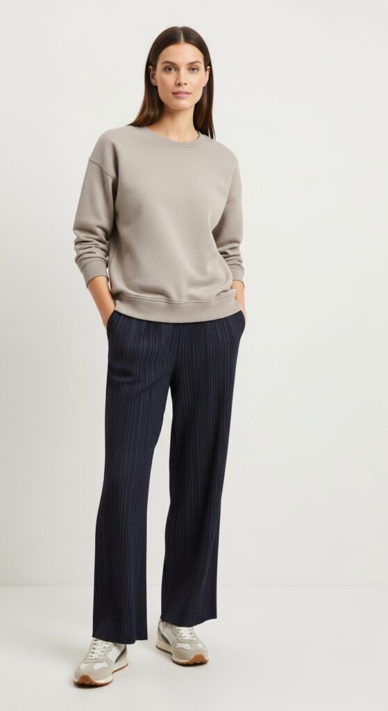 Here’s where comfort meets unexpected chicness. A cozy sweatshirt with pleated trousers shouldn’t work this well, but it absolutely does. It’s the outfit equivalent of that friend who rolls out of bed looking amazing.