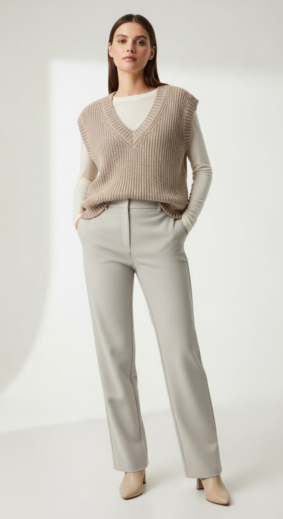 The knit vest trend isn’t going anywhere, and honestly, good. Layered over a simple long sleeve with straight leg trousers, it creates a look that’s preppy, modern, and surprisingly easy to pull off.