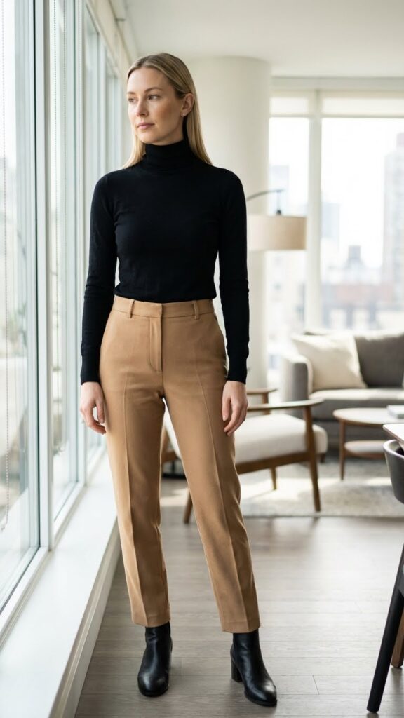 This combo is sleek, sophisticated, and surprisingly versatile. A fitted turtleneck tucked into high-waisted trousers creates a streamlined silhouette that’s both modern and timeless. It works across seasons too, which is always a bonus.