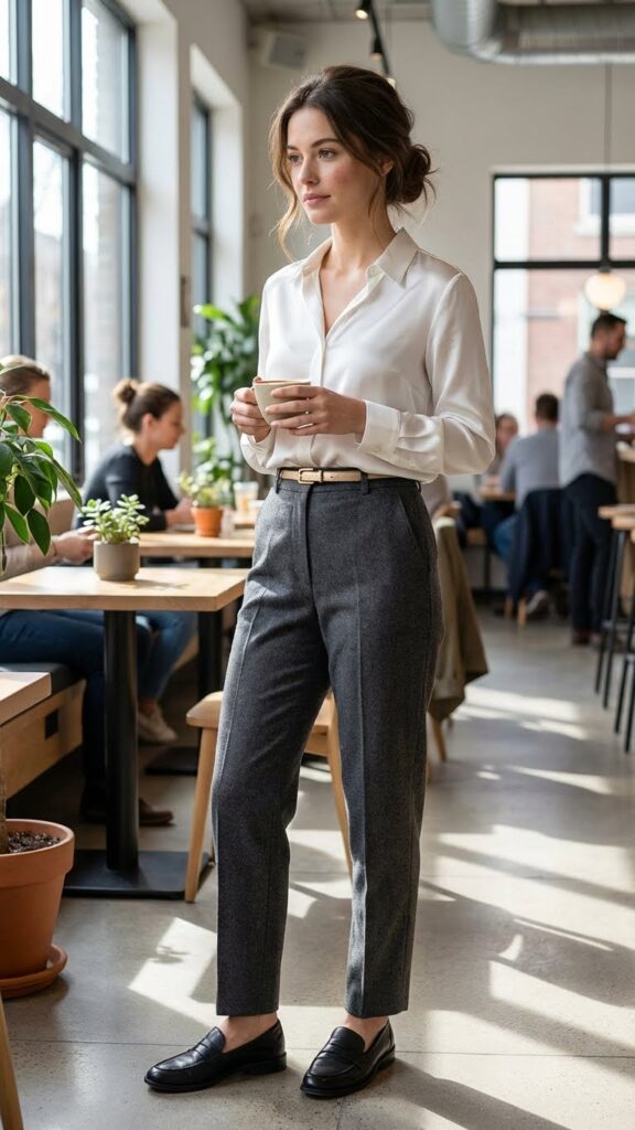 Nothing says “I’m a functioning adult” quite like tailored trousers. They’re comfortable (when you find the right pair), they’re polished, and they make you look like you actually ironed something (even if you didn’t). Pair them with a blouse tucked in at the front, and you’ve created a silhouette that’s both flattering and timeless.