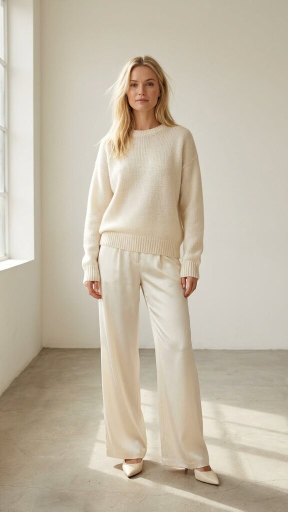 The trick is playing with different textures to keep things interesting. Pair a cashmere sweater with satin trousers, or match a leather skirt with a silk blouse in the same color family. Different fabrics in the same shade create depth and visual interest without the outfit looking boring.
