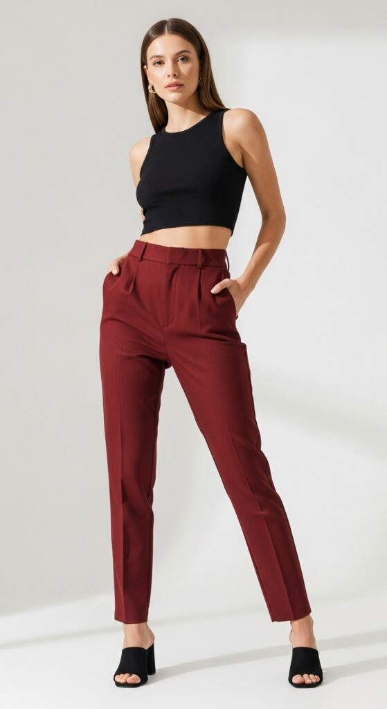 Plot twist: maroon trousers with a crop top. Yes, really. Hear me out, the high-waisted nature of most trousers makes them perfect for pairing with cropped styles, creating a balanced silhouette that’s both modern and flattering. Whether you go for a fitted crop sweater, cropped blazer, or even a cropped button-down, this combo feels fresh and fashion-forward.