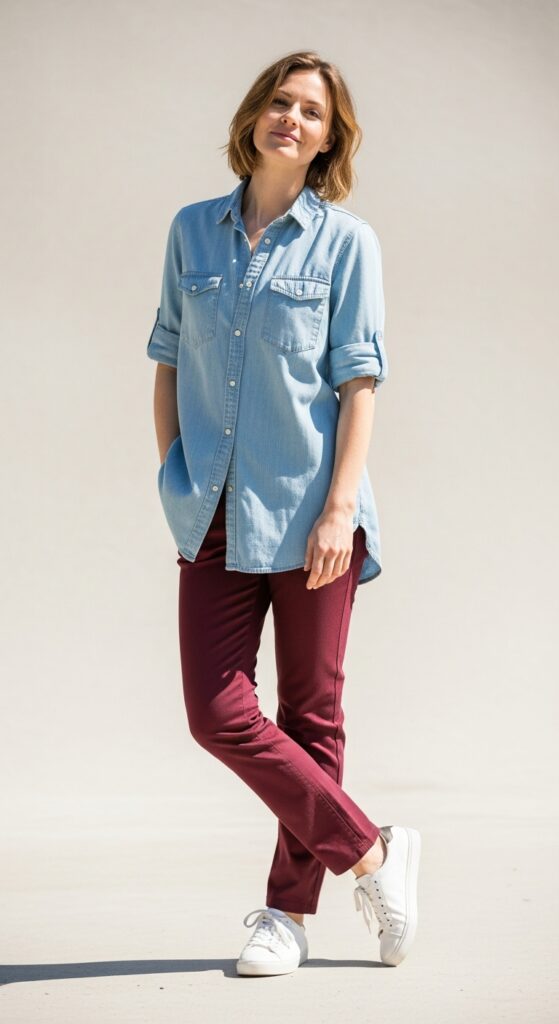 Style this casually by leaving it untucked with the sleeves rolled up, or tuck it in with a woven belt for something more structured. The chambray adds just enough texture and interest without competing with the richness of the maroon. Pair with white sneakers for weekend vibes or tan leather sandals when the weather’s nice. This outfit is basically the definition of effortless style, the kind of look where people ask “why do you always look so put-together?” and you’re like “I literally threw this on in five minutes.” That’s the magic of a good color and texture combo working together.