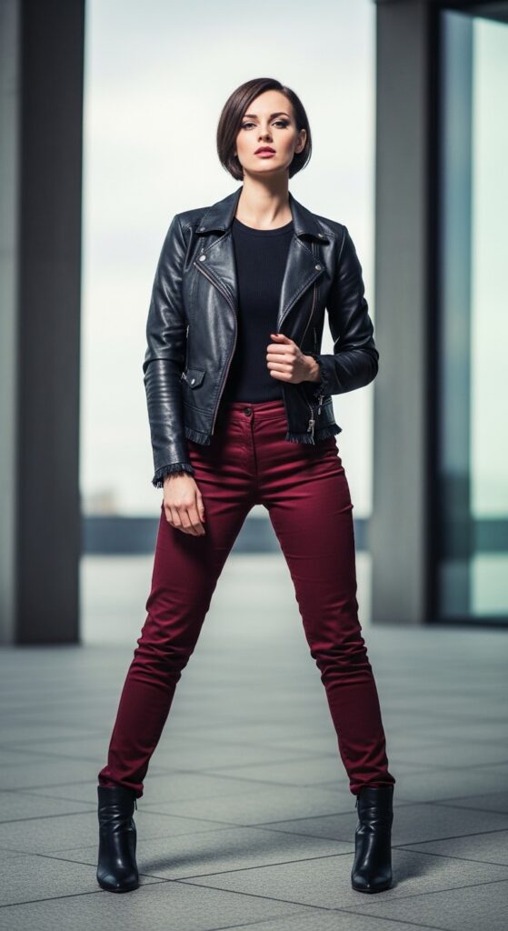 Want to add some serious attitude to your maroon trousers? Enter the leather jacket. This pairing is chef’s kiss because it takes those wine-colored pants from sweet and sophisticated to bold and badass in seconds. Whether you go with classic black leather or mix it up with a brown moto jacket, you’re creating a look that means business.