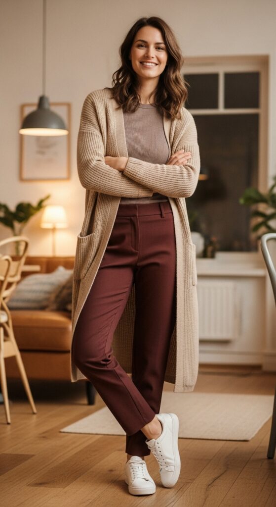 Layer the cardigan over a simple tank or fitted tee and let those maroon trousers do their thing. The long line of the cardigan elongates your silhouette while the structured trousers keep everything from looking too slouchy. Add white sneakers for casual cool or mules for slightly elevated comfort. This outfit is basically the fashion version of a warm hug, it feels good and looks even better. Plus, pockets in cardigans? Game changer for holding your phone while looking effortlessly stylish.