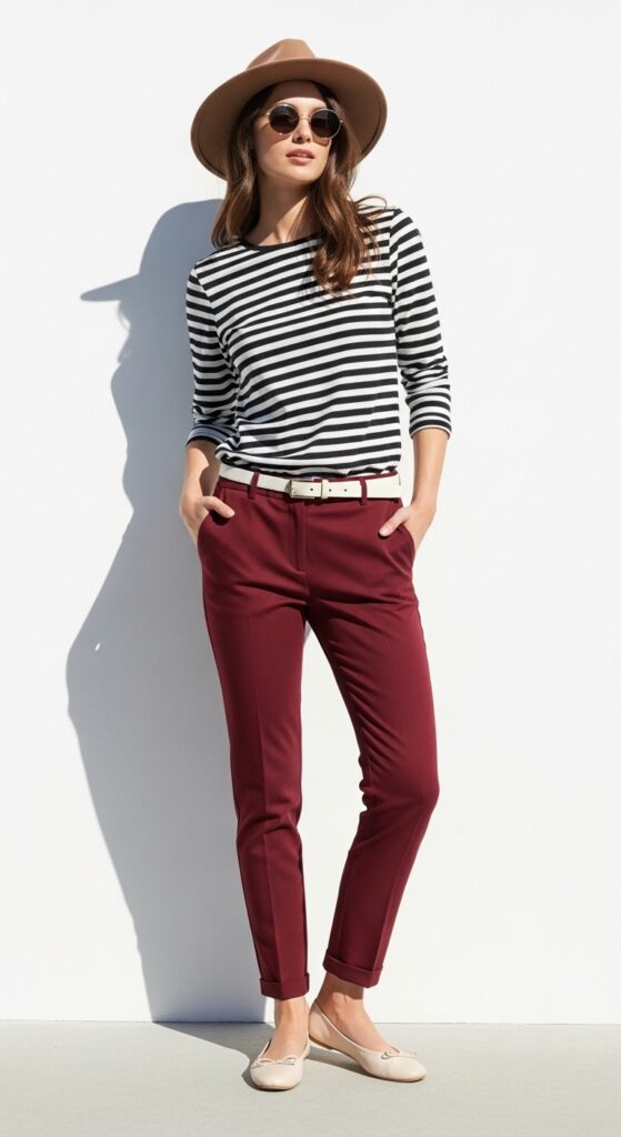 Keep the styling simple to let the stripe-and-color combo shine. Tuck that shirt in, add a simple belt, and you’re golden. The stripes add visual interest without overwhelming the look, while the maroon keeps everything grounded and sophisticated. Finish with ballet flats, loafers, or white sneakers depending on your mood. I once tried this with heels for a dinner date and let’s just say, the compliments didn’t stop. It’s one of those outfits that feels casual but photographs like you hired a stylist.