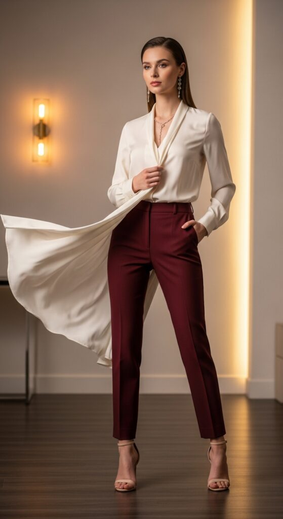 When you need to look like a grown-up who has their act together, maroon trousers with a silk blouse is your move. The luxe fabric of the blouse elevates the entire outfit, making it perfect for date nights, fancy dinners, or any occasion that requires a little extra polish. Go for ivory, champagne, or even a soft blush pink for a romantic, sophisticated palette.