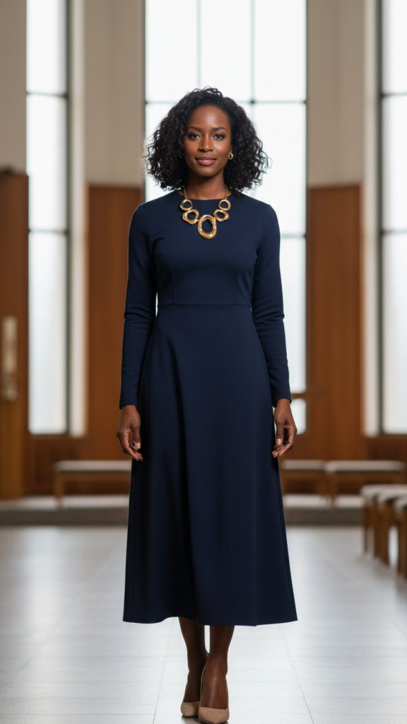 Choose a midi-length shift in navy, burgundy, or classic black, then add a structured cardigan in complementary tones. Your accessory pairing should include pearl earrings, a delicate necklace, and comfortable block heels. This combination allows you to express your personal style while respecting traditional dress codes, giving you the freedom to worship confidently and comfortably.