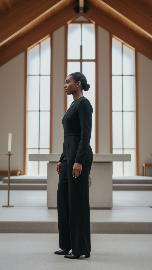 A monochromatic color scheme in navy, charcoal, or cream creates visual harmony and elongates your silhouette beautifully. The high waistline accentuates your natural curves while providing comfortable coverage throughout the service. An all-black ensemble provides a particularly dignified foundation that honors traditional church dress codes while maintaining sophisticated appeal.