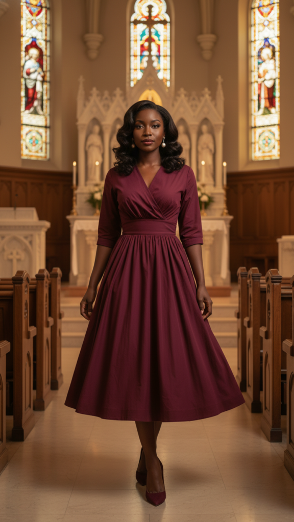 Look for styles with three-quarter sleeves and midi-length hems that hit below the knee. A textured fabric like jacquard or brocade adds visual interest without being distracting. Consider options with a delicate sheer overlay at the neckline for sophisticated detail. For a fresh take on church elegance, consider white church outfits that showcase clean lines and timeless sophistication. Pair with nude pumps and simple jewelry to let the dress’s rich color take center stage during worship.