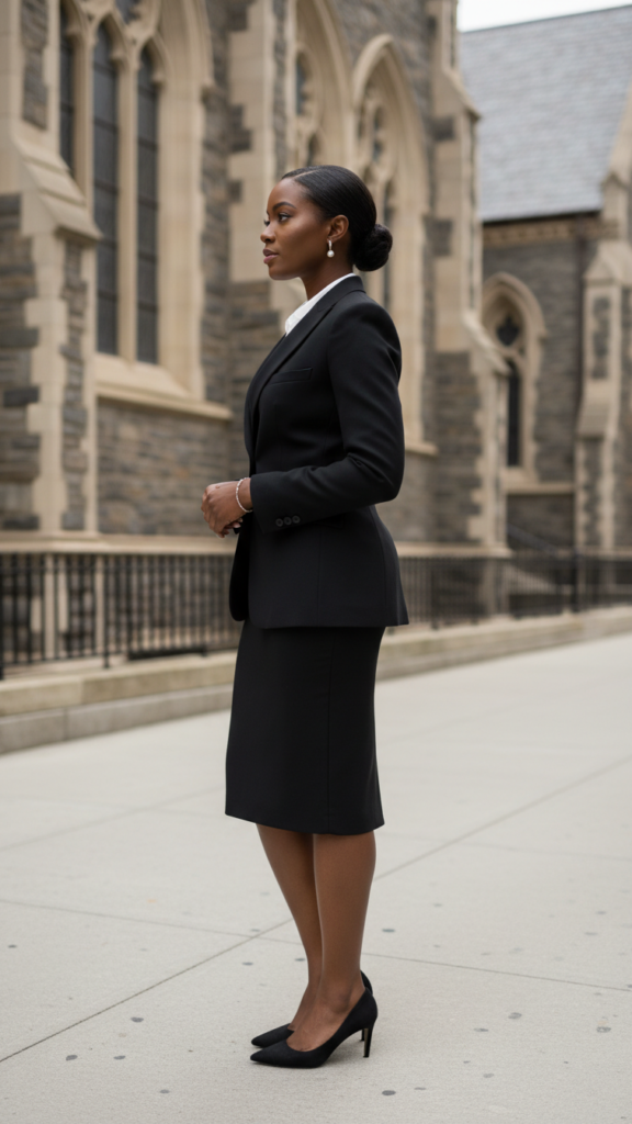 You’ll want to balance the suit’s crisp lines with feminine touches like delicate pearl earrings or a silk scarf draped around your neck. Keep minimal accessories as your guiding principle—select one statement piece rather than layering multiple items. Complete your look with pointed-toe flats or low block heels that’ll keep you comfortable throughout the entire service while maintaining that polished appearance.
