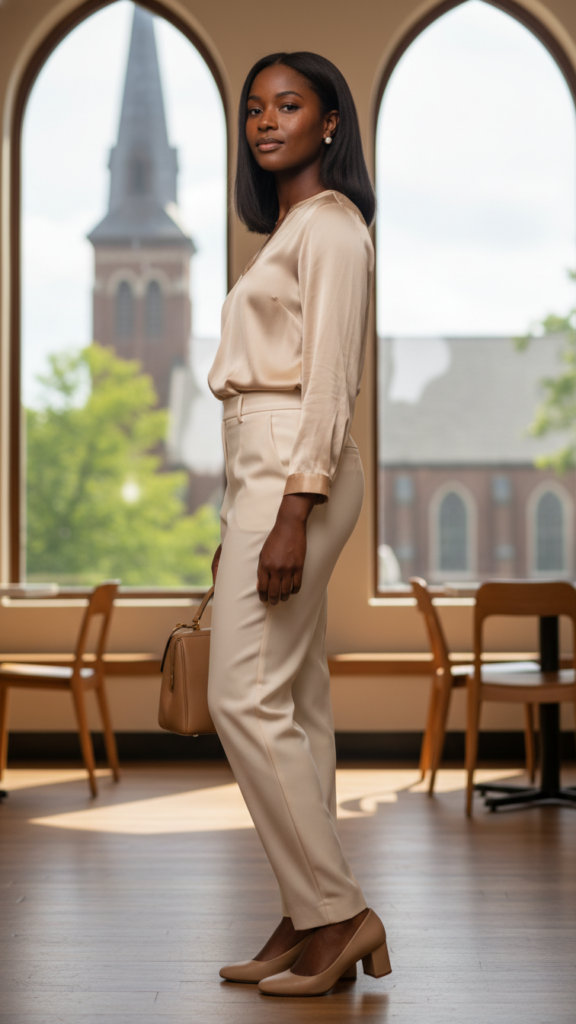 Sophisticated tailoring meets timeless elegance when you choose high-waisted trousers paired with a luxurious silk blouse for your Sunday service ensemble. This polished combination offers you the freedom to move gracefully while maintaining impeccable style standards.
