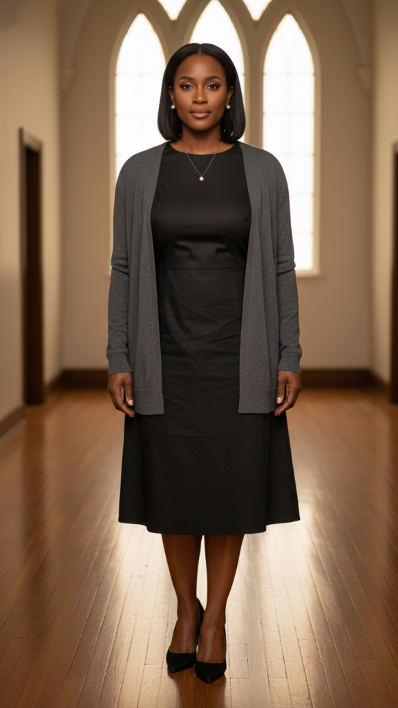 A classic shift dress paired with a sophisticated cardigan creates one of the most versatile and appropriate church outfits you can choose. This layered look offers perfect coverage while maintaining a graceful silhouette that flatters every body type.
