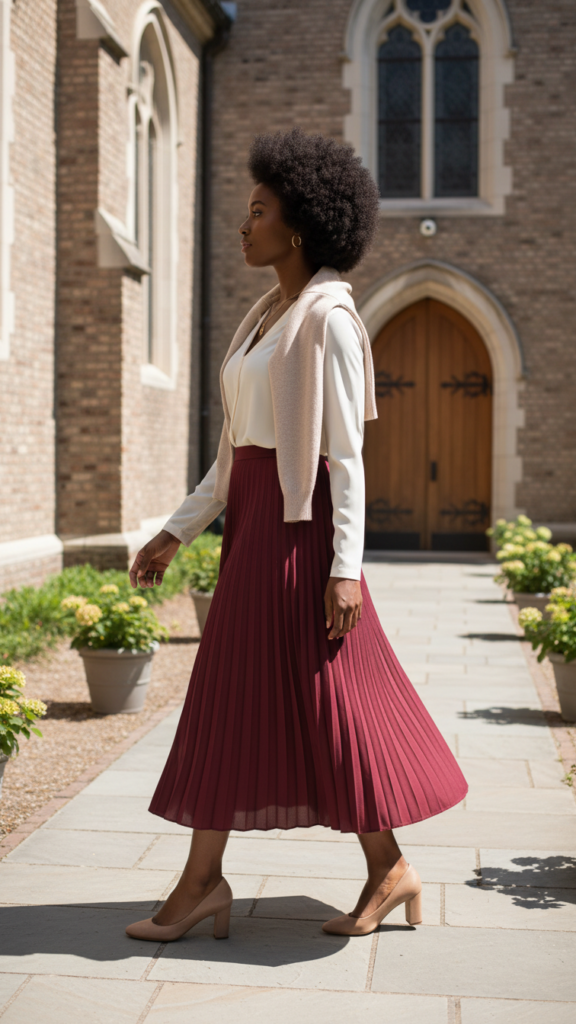 When you’re seeking a feminine yet polished church look, pleated A-line skirts paired with fitted tops deliver timeless elegance that’s both comfortable and appropriate. Choose midi length pleated skirts in navy, burgundy, or classic black for versatility and modest coverage.