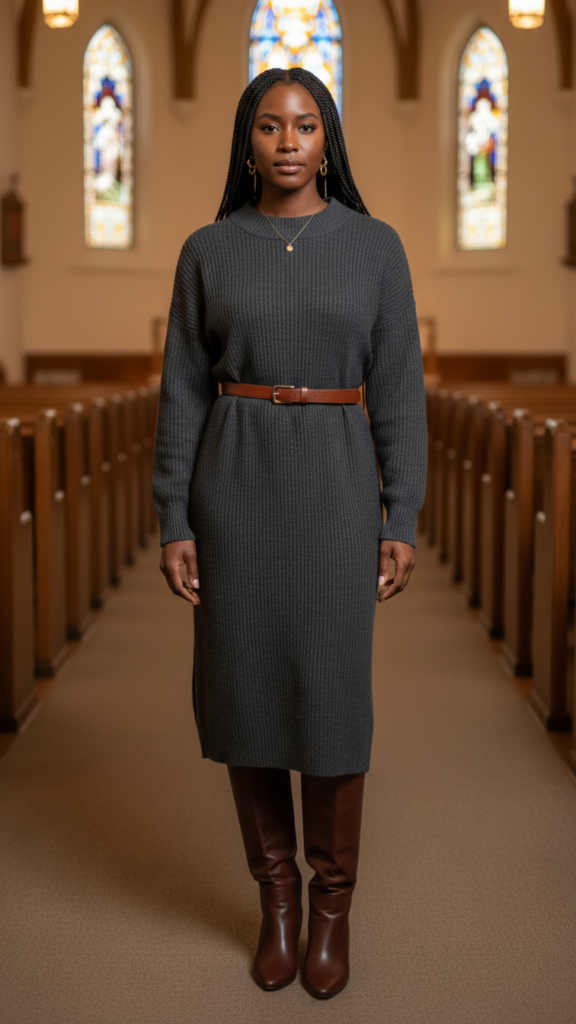 Add a coordinating belt to create a flattering belt silhouette that accentuates your waistline beautifully. Choose leather or fabric belts in complementary colors like burgundy, navy, or classic black. Pair with knee-high boots or classic pumps to complete your ensemble. These cold-weather outfits ensure you stay comfortable while maintaining appropriate modesty for church services. This outfit works seamlessly from morning service through evening fellowship activities.