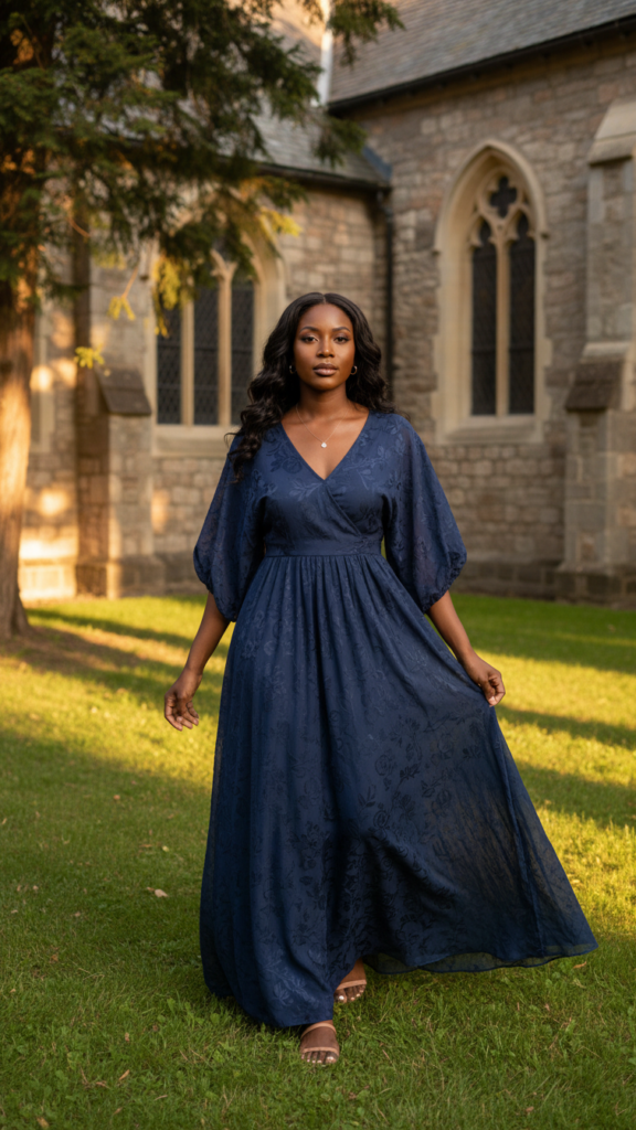 Flowy maxi dresses with three-quarter sleeves offer effortless elegance that’s perfect for worship services across all seasons. You’ll love how these versatile pieces move gracefully while providing appropriate coverage for church settings.