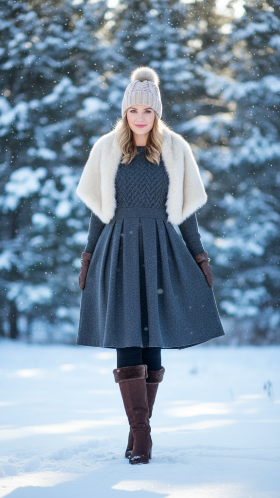 Choose a midi dress in rich jewel tones or classic neutrals, then layer opaque tights underneath for extra warmth. Classic ankle boots complete this polished look while providing practical comfort for walking on icy sidewalks.