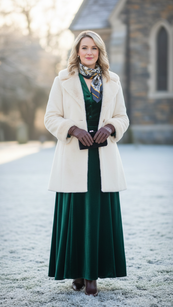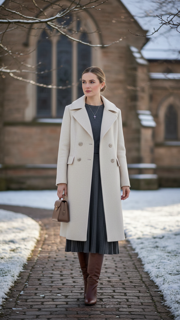 A classic wool coat paired with a midi dress creates one of the most refined and weather-appropriate church outfits for cold seasons. You’ll stay warm while maintaining a sophisticated silhouette that’s perfect for worship services.