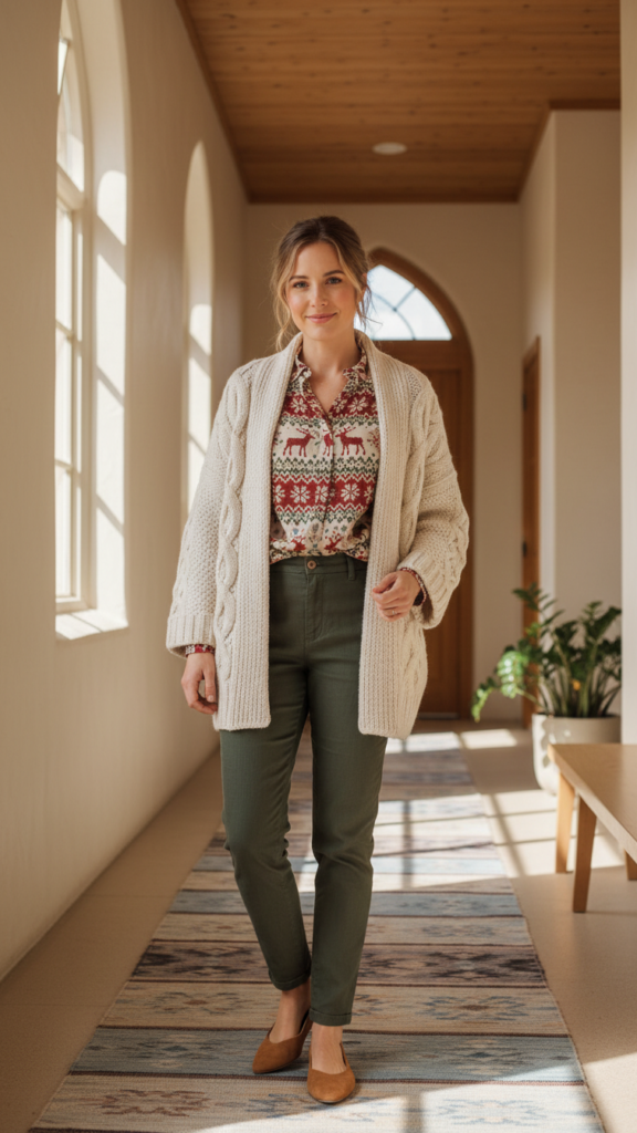 When temperatures drop but you still want to look polished for church, layered cardigans offer the perfect balance of warmth and sophistication. Start with a festive print blouse as your foundation, then add a lightweight cardigan for your first layer.