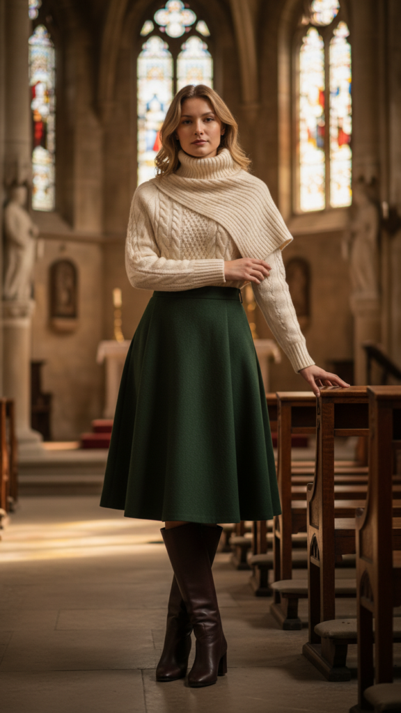 Complete this look with knee-high boots or ankle booties that provide both warmth and style. Dark-colored turtlenecks work beautifully with lighter skirts, while neutral tones offer versatility you can accessorize freely. This combination gives you comfort and confidence throughout the entire service while maintaining the modest styling that’s perfect for church settings.