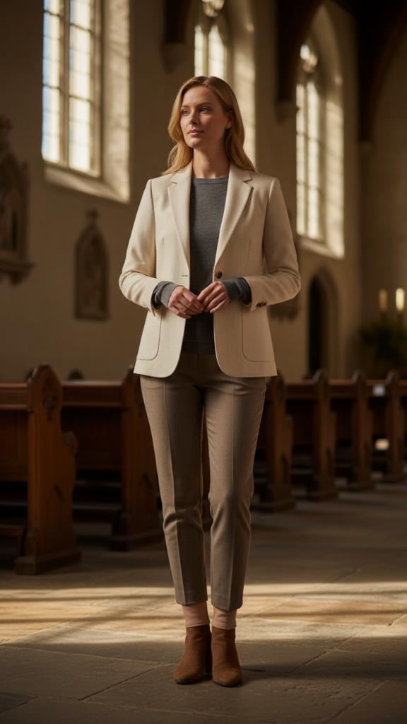 Blazers paired with scarves create professional church attire that strikes the perfect balance between corporate elegance and Sunday reverence. You’ll achieve sophisticated warmth by selecting a structured blazer in navy, charcoal, or burgundy paired with tailored dress pants.