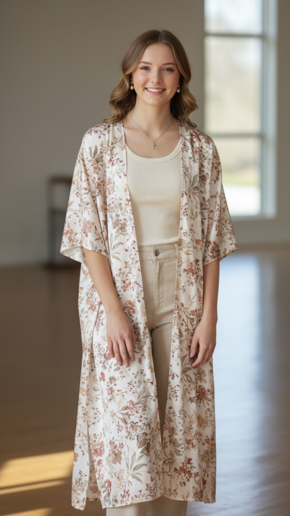 For teens who prefer more casual styling options, layered tank tops paired with flowing kimonos create effortlessly chic church outfits that feel both comfortable and respectful. You’ll love how this versatile combination adapts to different seasons and personal preferences.