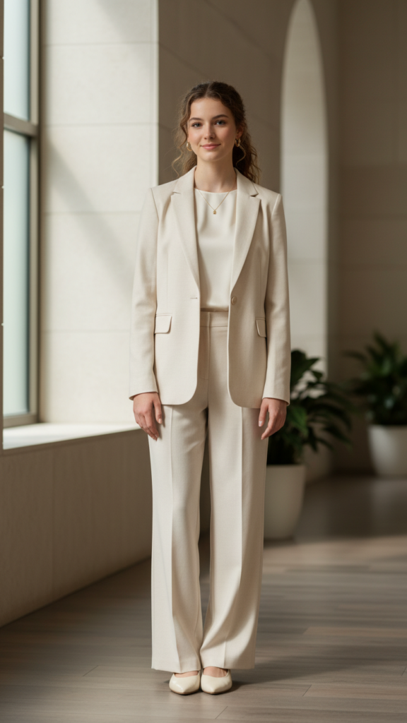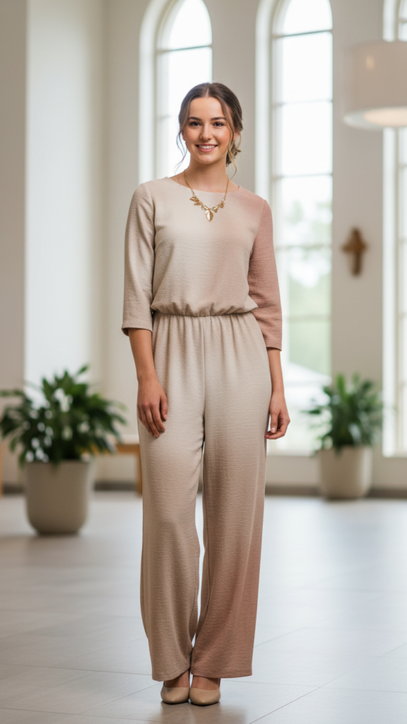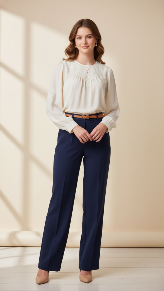 For teens who prefer separates over dresses, a flowy blouse paired with high-waisted trousers creates a sophisticated yet age-appropriate church ensemble that’s both comfortable and stylish. Choose a cream or pastel blouse with subtle details like pintucks or delicate embroidery.