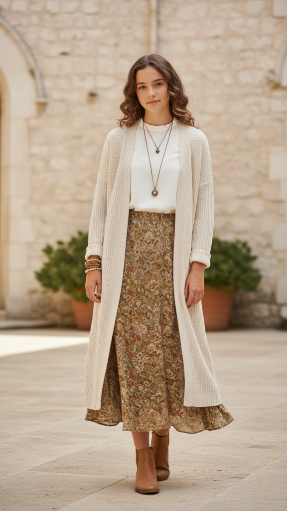 A neutral color palette of cream, beige, and soft gray creates effortless coordination that feels authentically you. Pair your long cardigan with midi skirts, straight-leg jeans, or flowy dresses to achieve that coveted boho-chic aesthetic. Embrace earthy elements like natural fabrics and organic textures to complete your boho-inspired look. This versatile layering piece moves seamlessly from worship service to brunch without compromising style or comfort.