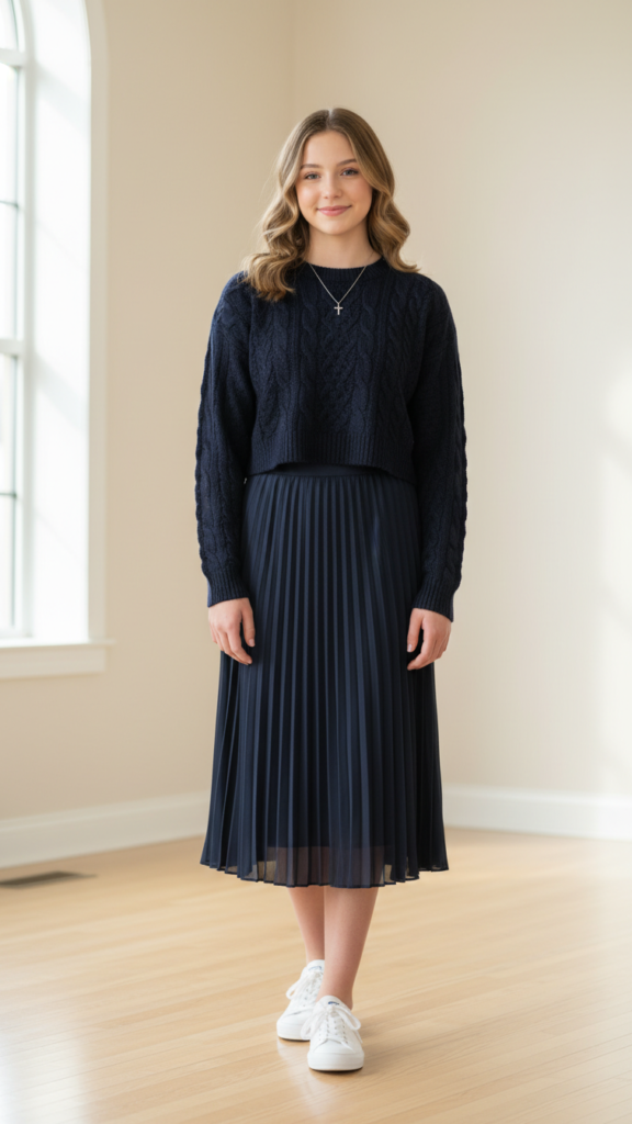 The pleated skirt silhouette adds movement and elegance while maintaining appropriate length for worship services. Choose a cropped sweater that hits just above your natural waistline to create flattering proportions without showing skin.