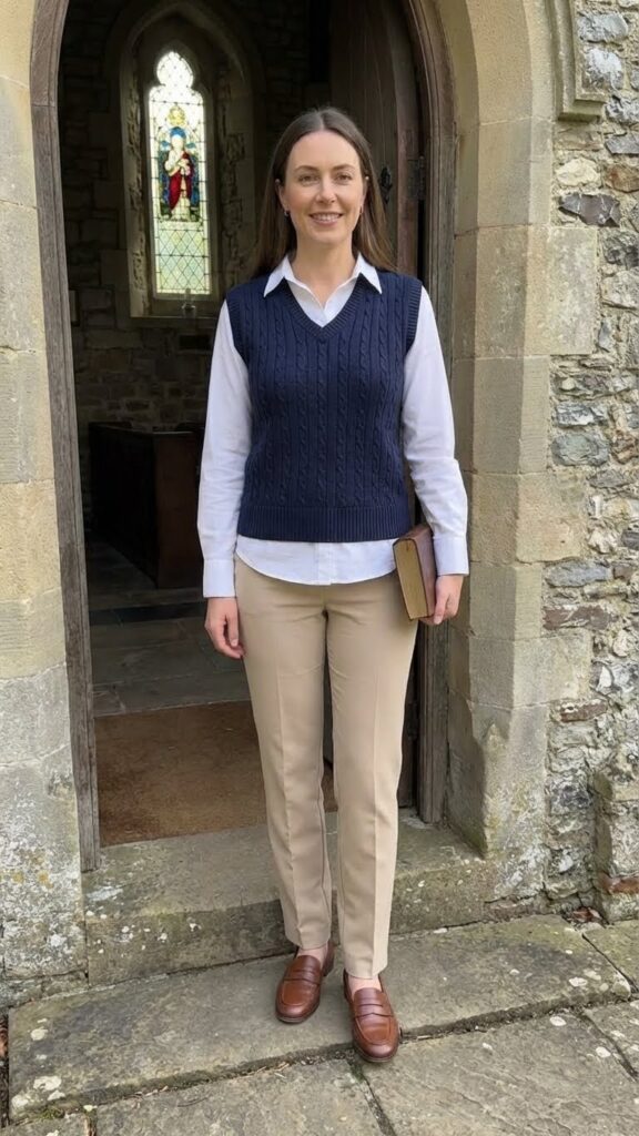 The preppy-inspired sweater vest layered over a crisp collared shirt delivers timeless sophistication that’s perfect for creating a polished church outfit with scholarly charm. This classic combination gives you academic elegance while maintaining appropriate coverage for worship services.