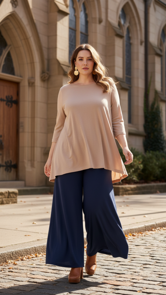Palazzo pants paired with a flowy tunic create one of the most comfortable and modest church outfit combinations you’ll find in your wardrobe. The wide-leg pants offer unrestricted movement while maintaining a refined appearance that’s perfect for worship services.