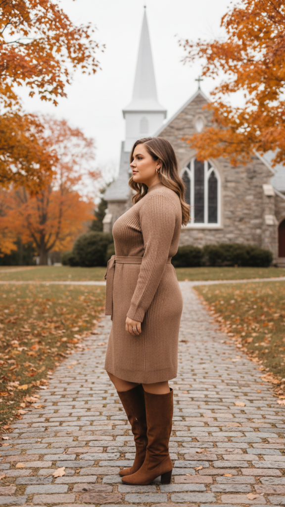 Look for dresses with a cinched waistline or add a belt to define your silhouette beautifully. Knee-high boots in leather or suede complement the cozy texture perfectly. This combination offers comfort during lengthy services while expressing your personal style. You’ll feel confident and appropriately dressed for worship.