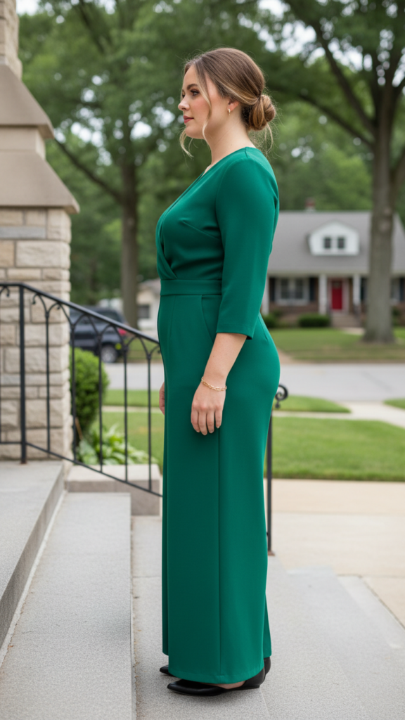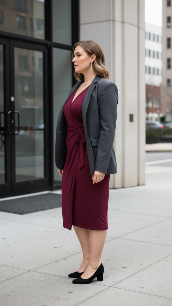 A wrap dress paired with a structured blazer creates one of the most flattering and professional church outfit combinations for plus-size women. The wrap style naturally creates a cinched waistline that accentuates your curves beautifully while maintaining modest coverage.