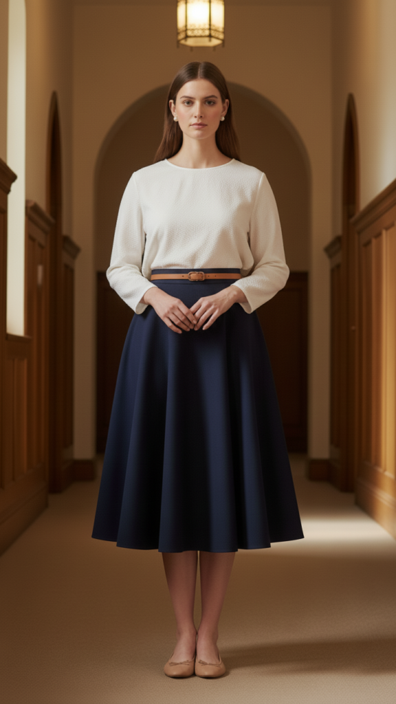 Choose A-line or pencil skirts that hit at or below the knee for appropriate coverage. Tuck soft blouses or structured button-downs into the waistband to define your midsection beautifully. Add a thin belt to accentuate the waist further, and complete the look with low heels or flats for comfortable worship attendance. These modest outfit combinations work beautifully for women of all ages seeking appropriate church attire.