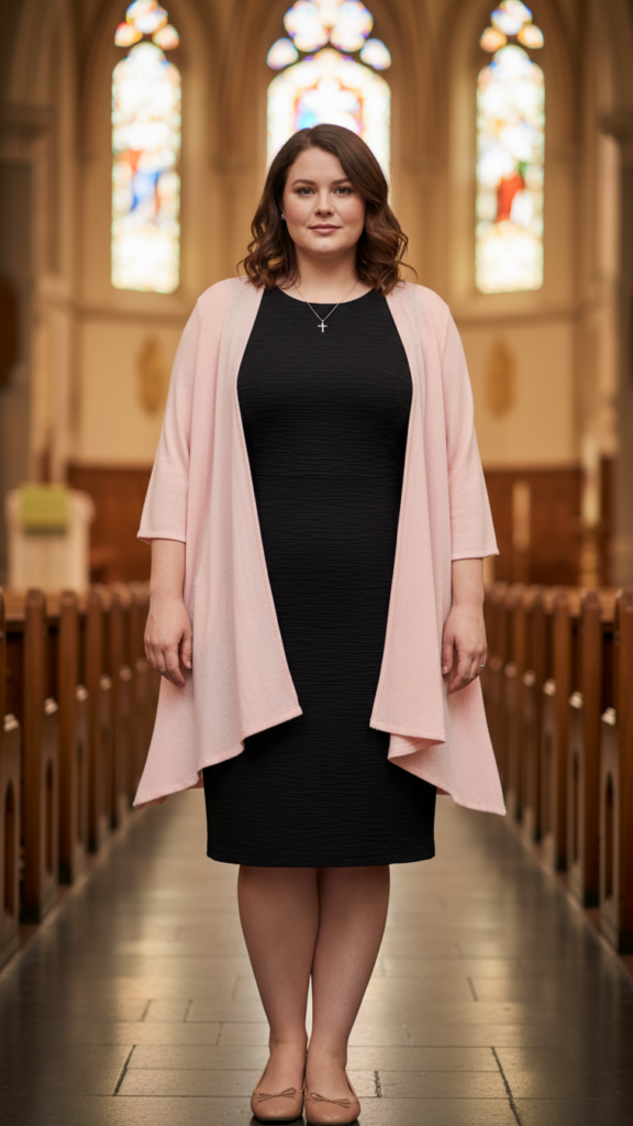 A sleeveless sheath dress paired with a layered cardigan offers the perfect solution for temperature control while maintaining a refined church-appropriate appearance. You’ll love how this combination creates a simple silhouette that flatters your curves without being restrictive.