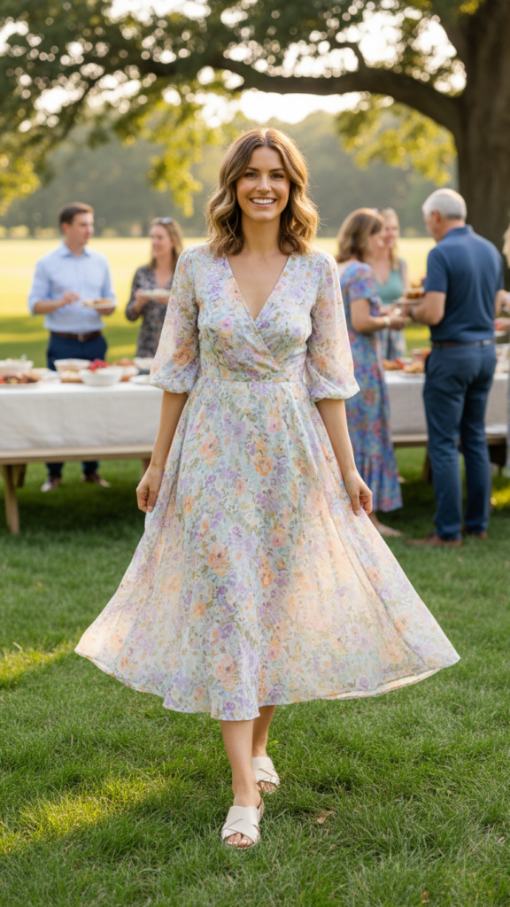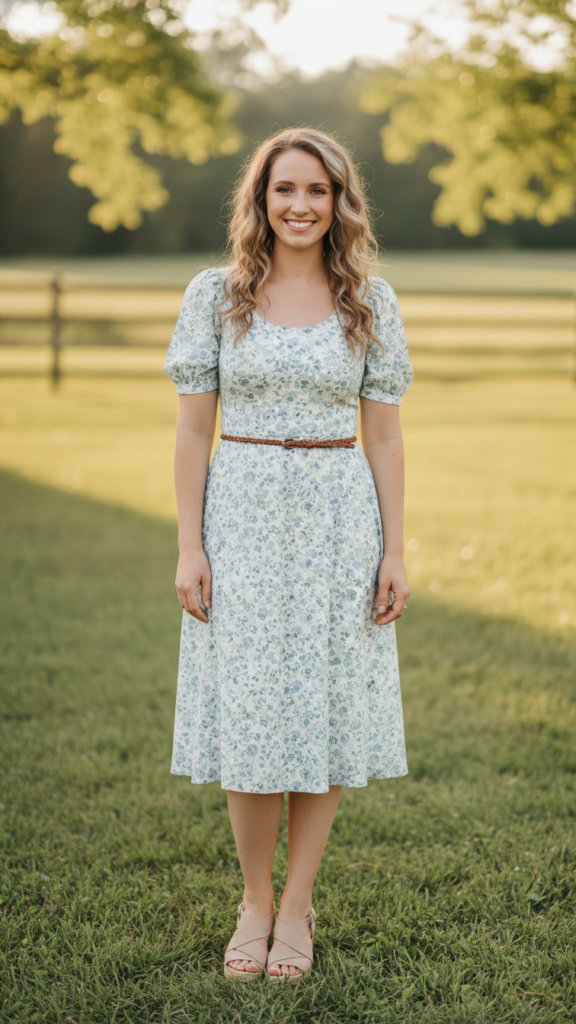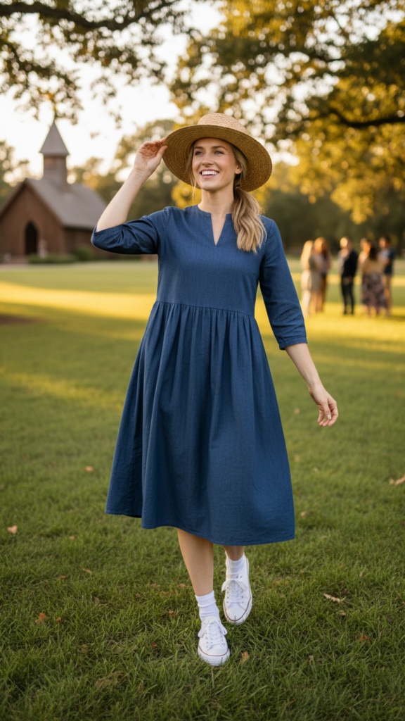 A knee-length sundress paired with wedge sandals creates the perfect balance of feminine charm and appropriate coverage for church picnic settings. Choose breathable fabrics like cotton or linen that’ll keep you comfortable during outdoor activities while maintaining a polished appearance.