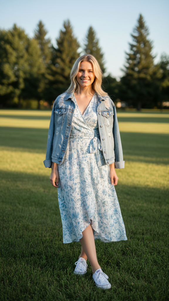 Canvas sneakers offer superior comfort for walking on grass and uneven surfaces. White or neutral colors complement most dress patterns beautifully. For a layered look, add a denim jacket or cardigan. Don’t forget to accessorize with belt to define your waist and enhance the overall style effortlessly.