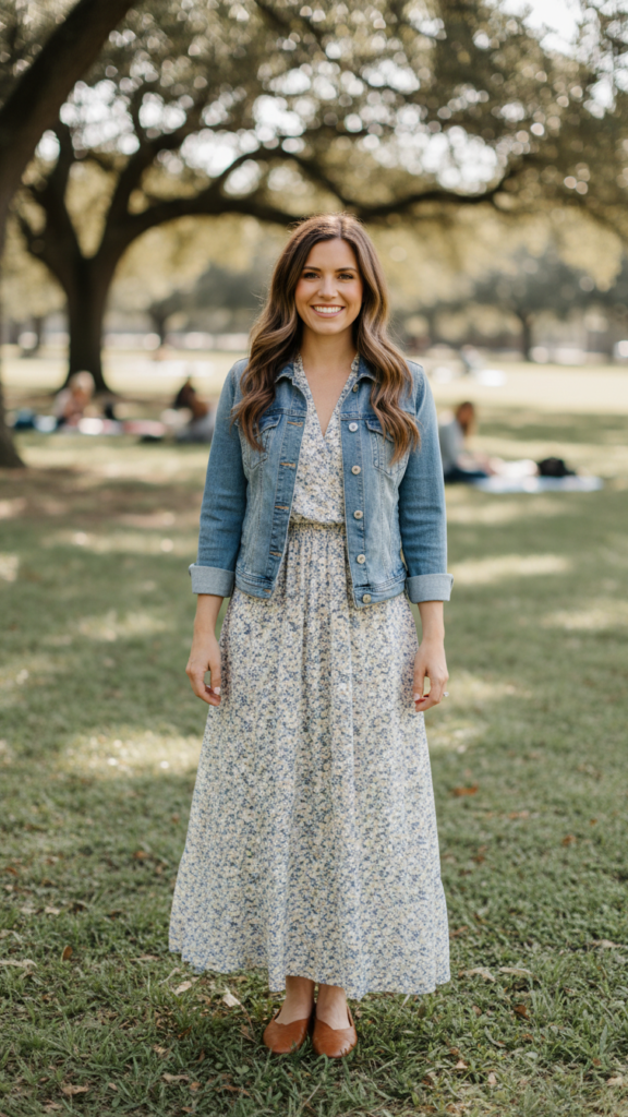 Choose a long sleeve maxi dress in breathable fabrics like cotton or jersey to stay cool during outdoor activities. The fitted denim jacket adds structure and warmth for cooler morning services or evening events. This layered approach gives you flexibility to adjust your comfort level throughout the day.
