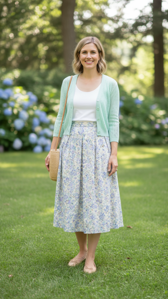 Versatility defines the midi skirt and lightweight cardigan combination, making it an ideal choice for church picnics that blend indoor and outdoor activities. You’ll appreciate how this pairing adapts seamlessly from morning worship to afternoon fellowship games.