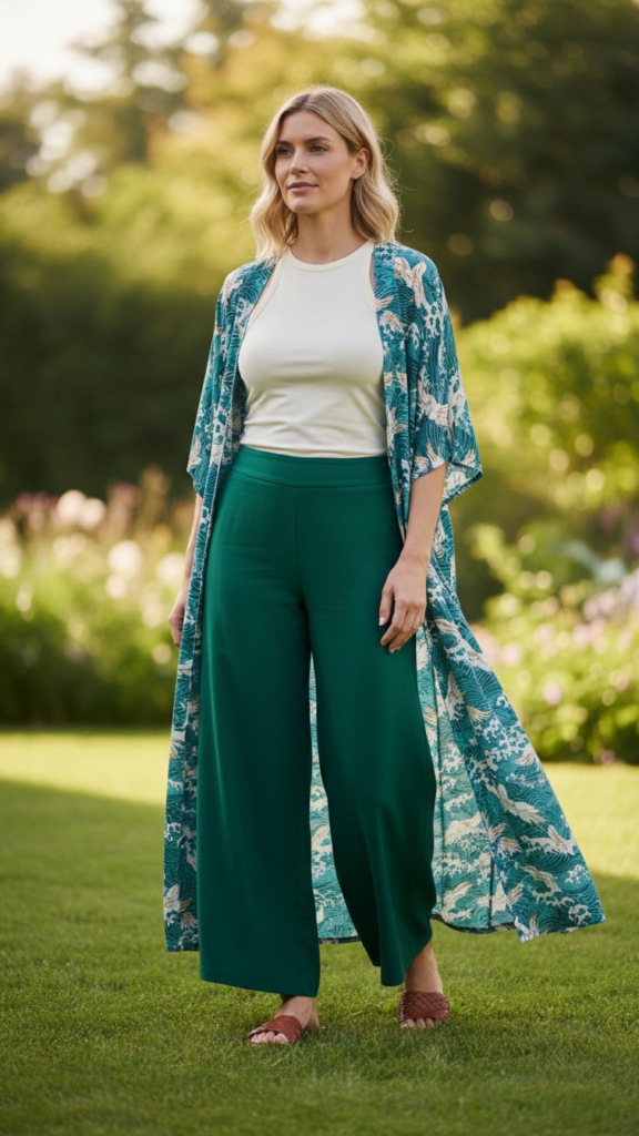 Pair wide-leg pants with a fitted, modest tank top that covers your shoulders appropriately. Layer a lightweight kimono over your ensemble for added elegance and sun protection.