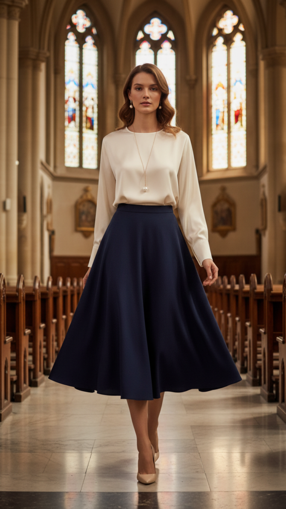For those seeking a more casual yet respectful church outfit, a denim A-line skirt creates the perfect foundation for comfortable worship attendance. The denim fabric offers durability while maintaining an appropriate level of formality for Sunday services. You’ll find the A line silhouette flatters most body types by cinching at the waist and flowing gracefully over hips.