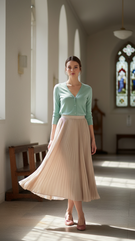 For comfortable elegance that moves beautifully throughout service, a flowy pleated maxi skirt creates the perfect foundation for your church ensemble. The flowing silhouette offers graceful movement while maintaining complete coverage with its modest hemline that extends to your ankles.